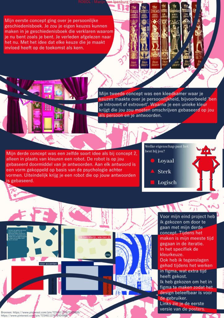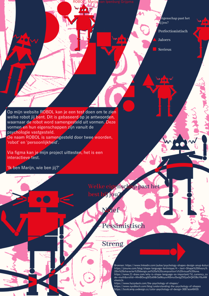 Ik ontwierp een website waarbij gebruikers, door een reeks vragen te beantwoorden, ontdekken welke robot het beste bij hun persoonlijkheid past. De uitkomst werkt vergelijkbaar met een kleurentest: op basis van je antwoorden krijg je een robot toegewezen die visueel aansluit bij de psychologie van vormen.
